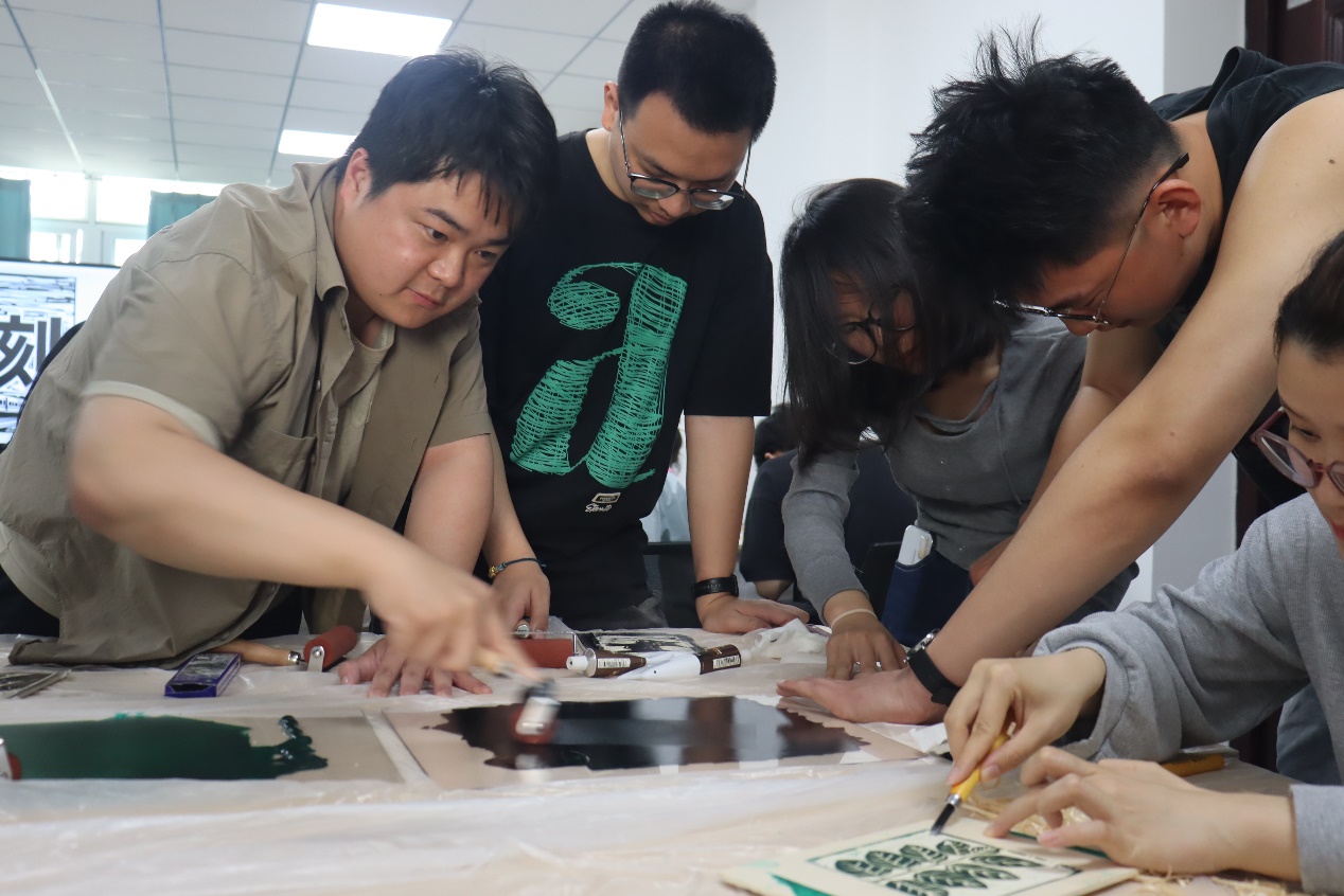 在完成版画雕刻后,师生们有序拿着画板前往印刷区进行染色。现场有黑色、绿色、红色三种颜色的染料可供选择,并准备了宣纸、皮纸等不同类型的纸张。在专业老师的指导下,同学们纷纷上手体验磨墨、上色、印刷的过程,并将自己的作品放到精美画框里装裱起来。