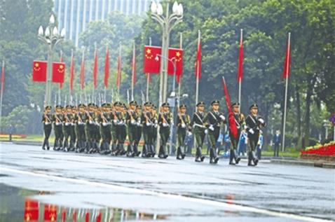 7时50分,国旗护卫队护送着五星红旗走来,他们着装整齐,步伐威武雄壮,穿过长安街来到旗杆下,8时,随着一声敬礼,擎旗手以优美有力的动作将国旗抛出,《国歌》响起,回荡在广场上空,打伞的也都放下了手中的雨伞,万人齐聚的天府广场庄严肃穆。一双双真挚的眼睛追随着那面鲜红的国旗,一颗颗激动的心屏息期待国旗的飘扬。大家心潮澎湃,心中激荡着自豪感和责任感,涌动着对祖国的热爱和对民族过往历史的敬畏。