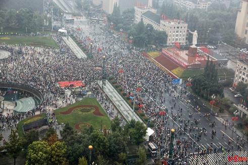 启程之后,天空忽然下起了小雨,成员们都没有带伞,雨水打湿了大家的衣服,但是在强烈的爱国之情的感染下,大家的心里都暖暖的。虽然天还未亮,但路上的市民却越来越多,大家的方向也都是一致的,车队也在不知不觉中从十几个人壮大到几十个人。虽然大家可能来自不同的地方,但此刻大家的心情都是相同的——为祖国庆生,为祖国自豪!大家来到天府广场时,这里已是人山人海,虽然雨越下越大,但依旧挡不住祖国人民的热情。刚进入广场不久,便听到后方传来广场已满载禁止进入的声音。