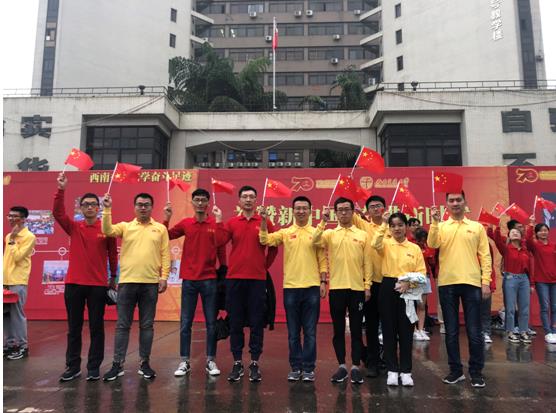 组织的升旗仪式。当天早晨,虽有秋雨当头,可支部党员观看升旗仪式的积极态度和分外热情却丝毫不减。按时到场、组织有序、态度严肃认真、精神饱满士气足,无不彰显着支部党员对本次升旗仪式的重视和认真。雄壮的《义勇军进行曲》奏响,支部党员同参加其他参加升旗仪式的同学高唱国歌,目送熠熠生辉的灿烂五星红旗升起。升旗结束后,全体参加人员同唱歌曲“我和我的祖国”,并高呼对祖国的祝语完成献礼祖国母亲微视频的拍摄。