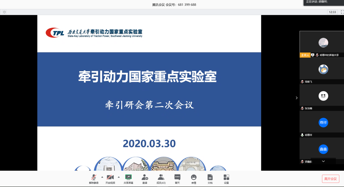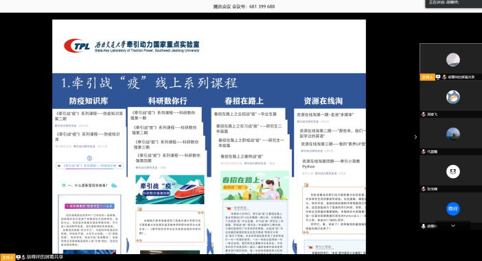 做好疫情防控中的学生活动开展,2020年03月30日下午3点,牵引动力研究生召开了本学期第一次线上会议,对疫情期间研会开展的工作进行了阶段性的总结,并对研会下阶段的工作进行了规划。会议由牵引研会主席胡尊祥主持,辅导员郭鑫鑫老师及全体研究生会成员参加。