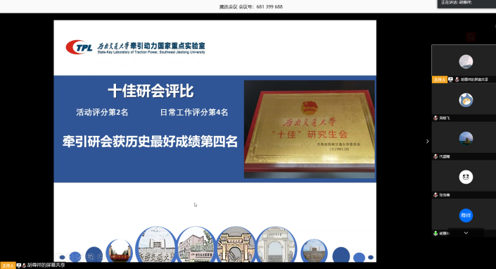 接着,研会主席胡尊祥同学对牵引研会工作做了阶段性总结。在全体研会同学以及辅导员老师的共同努力下,牵引研会在2019年度荣获校“十佳”研究生会荣誉称号,活动评分全校校第二名,日常工作评分全校第四名。这既是对前期牵引研会工作的充分肯定,也是牵引研会未来发展的风向标。疫情期间,在牵引党委和学生工作组的领导下,牵引研会推出了牵引战“疫”系列线上课程以及牵引战“疫”之90后战疫系列,内容包括防疫知识库、科研数你行、春招在路上、资源在线淘、我思我想等板块,取得了良好的反响。这一切都离不开研会同学的默默地付出,尤其是负责牵引研会公众号运行相关的宣传部同学。由于疫情的原因,公众号发挥了非常大的作用。随后,胡尊祥同学阐述了本学期研会工作的要点,并号召学生干部积极参与青年大学习线上学习课程,增强青年的使命担当和责任感。