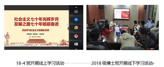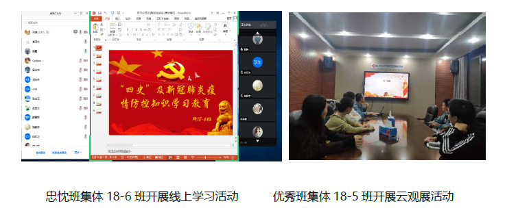 将学习“四史”和新冠疫情防控知识学习作为加强党支部建设长效机制的重要内容,并将其作为党支部“三会一课”、团支部“三会两制一课”等组织生活内容融入到党、团支部日常学习教育中,推动学习教育入脑、入心,明确学生党员、学生骨干带头学习,并深化落实到日常生活中。各个班级坚持集中学习与自主学习相结合,通过开展云观展、专题学习会、支部书记讲党课、观看红色电影等活动,以“线上+线下”的方式进一步推进学生党员增强“四个意识”、坚定“四个自信”、做到“两个维护”,提升广大学生知史爱国的思想意识,并将思想和行为在行动上将感悟与体会落实到本职工作中,增强守初心、担使命的思想自觉和行动自觉。