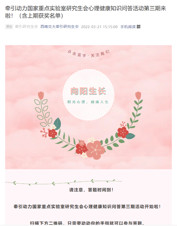 本次竞答活动以普及心理知识为目的,题目难度适中、操作简单易行,4期累计吸引了近200位同学参与,在牵引学子间广泛传播,营造了有利于研究生心理健康发展的校园氛围。