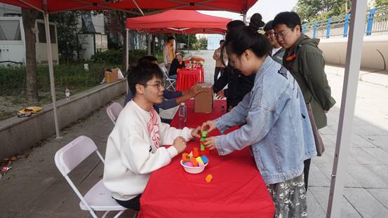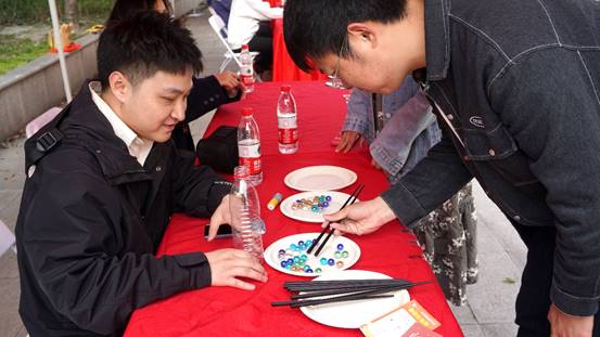紧接着的是“大珠小珠落玉盘”游戏,参与者只有在规定时间内夹取一定数量的弹珠并放至瓶子里才能获取通关印章,这不仅要求参与的同学们能够将技巧与力道充分结合,精准地夹取弹珠,更要求同学们具备平稳的心态,在锻炼同学们动手能力的同时,还能缓解同学们日常的紧张与焦虑。