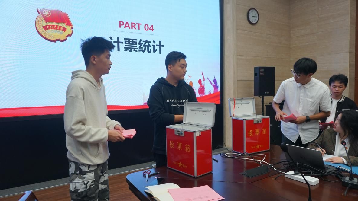 余卉随后介绍候选人信息,她对4位候选人的姓名、年龄、籍贯、政治面貌、职务等基本信息进行详细介绍。在正式投票环节,总监票人高天负责清点选票数,现场检查票箱。总计票人陈宇豪清点到会代表数并逐一发放选票。各位代表们现场填写选票并依次进行投票。