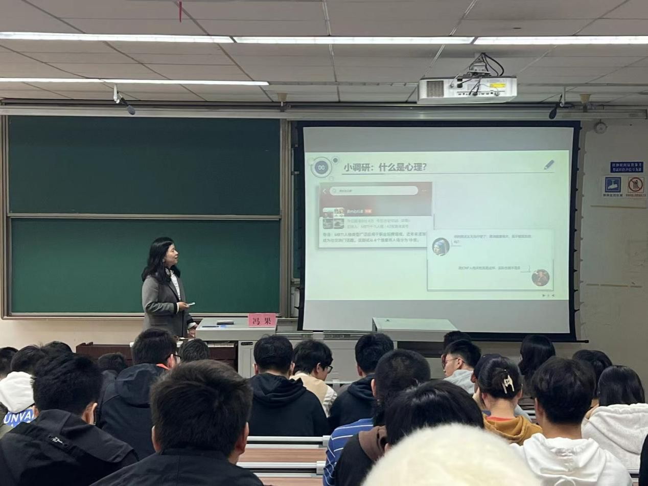 随后,高天老师向同学们介绍本次主讲老师冯果副教授。在同学们热烈的掌声中,由冯果老师主讲的“心理适应”讲座正式开始。冯果老师首先对同学们进行了“什么是心理”的小调研活动,以激发同学们的思考。接下来,冯果老师分别从什么是心理健康、常见的心理困扰、如何提升和维护心理健康三个方面展开讲座内容。