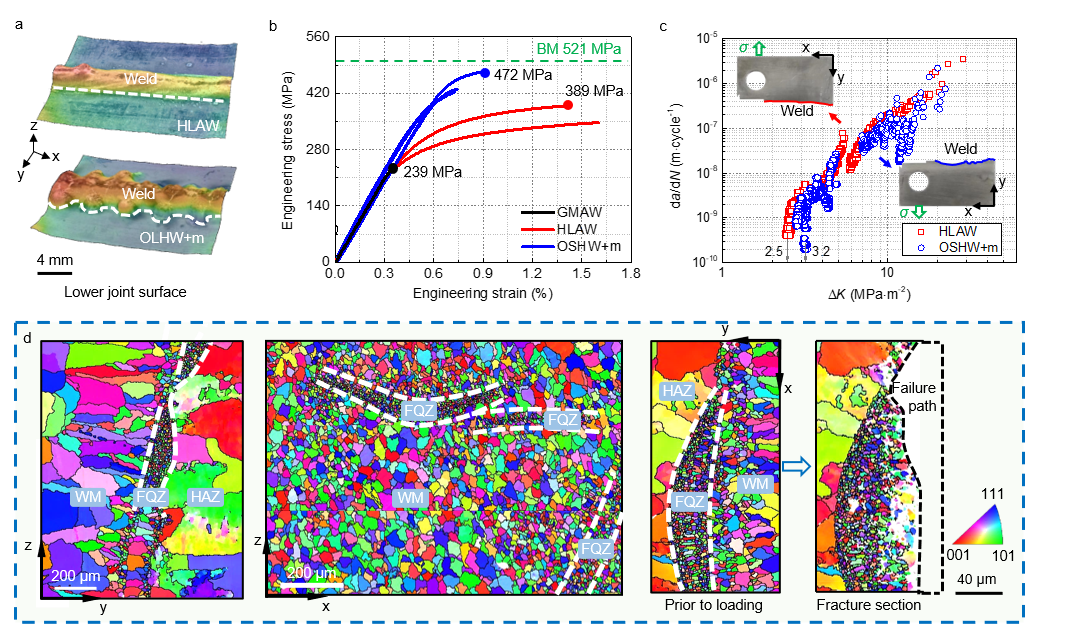 研究人员受到力学三明治结构的启发,提出焊缝有规律弯曲分布的成形思想,同时引入脉冲电磁场消除接头中微裂纹和气孔,来探索接头拉伸强度与抗疲劳性能大幅提升的可能。研究表明,传统接头熔合线附近的细晶带呈现连续且线性走向特征,而经过“激光扰动+磁场脉冲”成形后,细晶带在焊缝熔合线处将呈现出“S”形、断续分布特征,且部分细晶带由熔合线转移至焊缝中心,从而使得细小等轴非枝晶与粗大等轴枝晶实现了交替分布。一方面,“激光扰动+磁场脉冲”联合制造策略有助于改善合金元素分布,减弱强化元素晶界偏析程度,与传统焊接工艺相比,晶粒内部强化相数量增加,进而提升了接头的硬度和强度,使其达到了固相焊接水平。另一方面,“S”走向、断续分布的细晶带显著增加了裂纹扩展阻力,从而大幅提升了接头的“韧性”。此处所述的“韧性”主要指固体力学的损伤容限能力,而非简单地材料学中的断裂韧性。