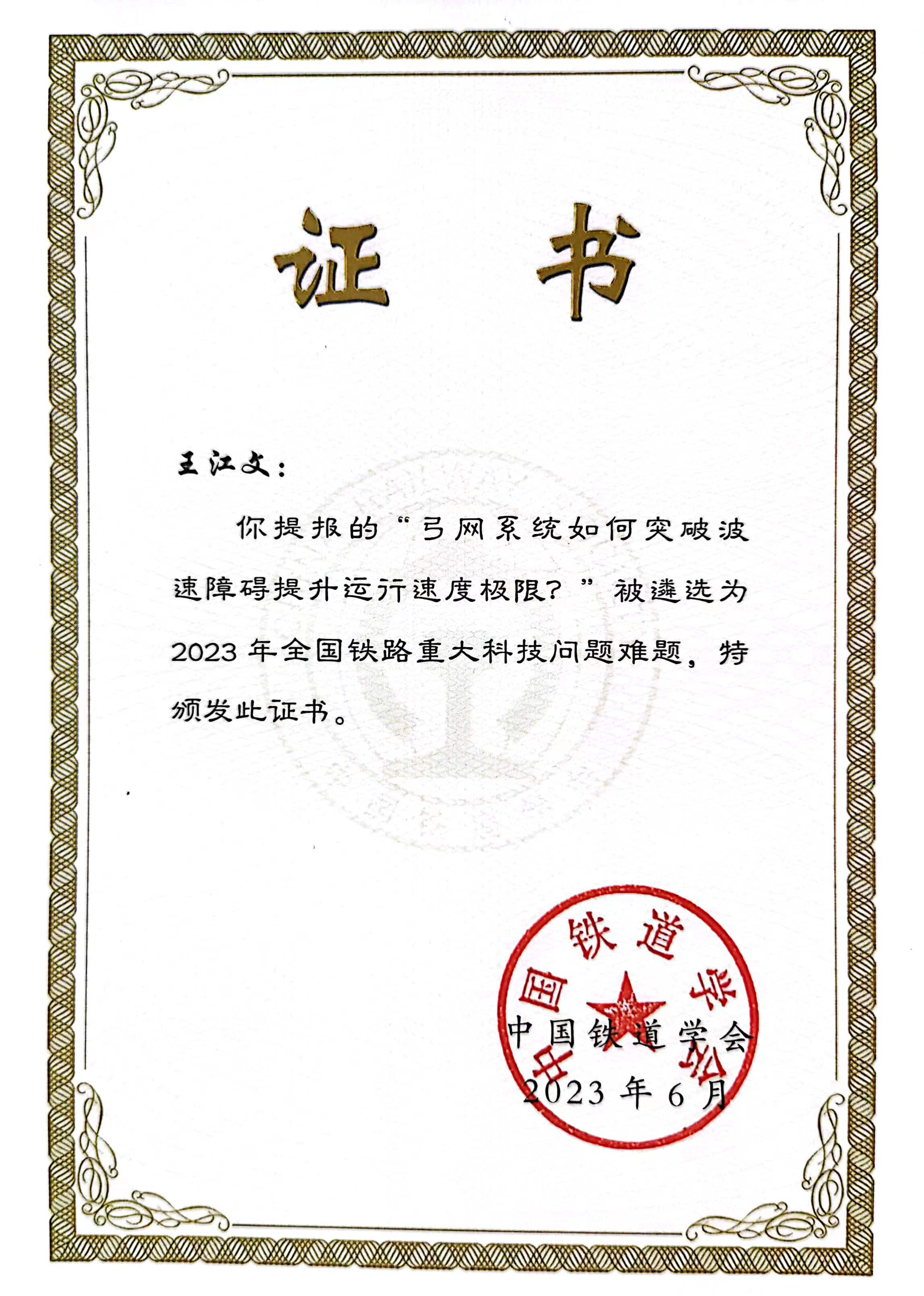 由av影片直播 张卫华教授推荐,王江文老师撰写提报的“弓网系统如何突破波速障碍提升运行速度极限”被遴选为2023年全国铁路重大科技问题难题,并上报中国科协。av影片直播 为全国唯一入选高校。