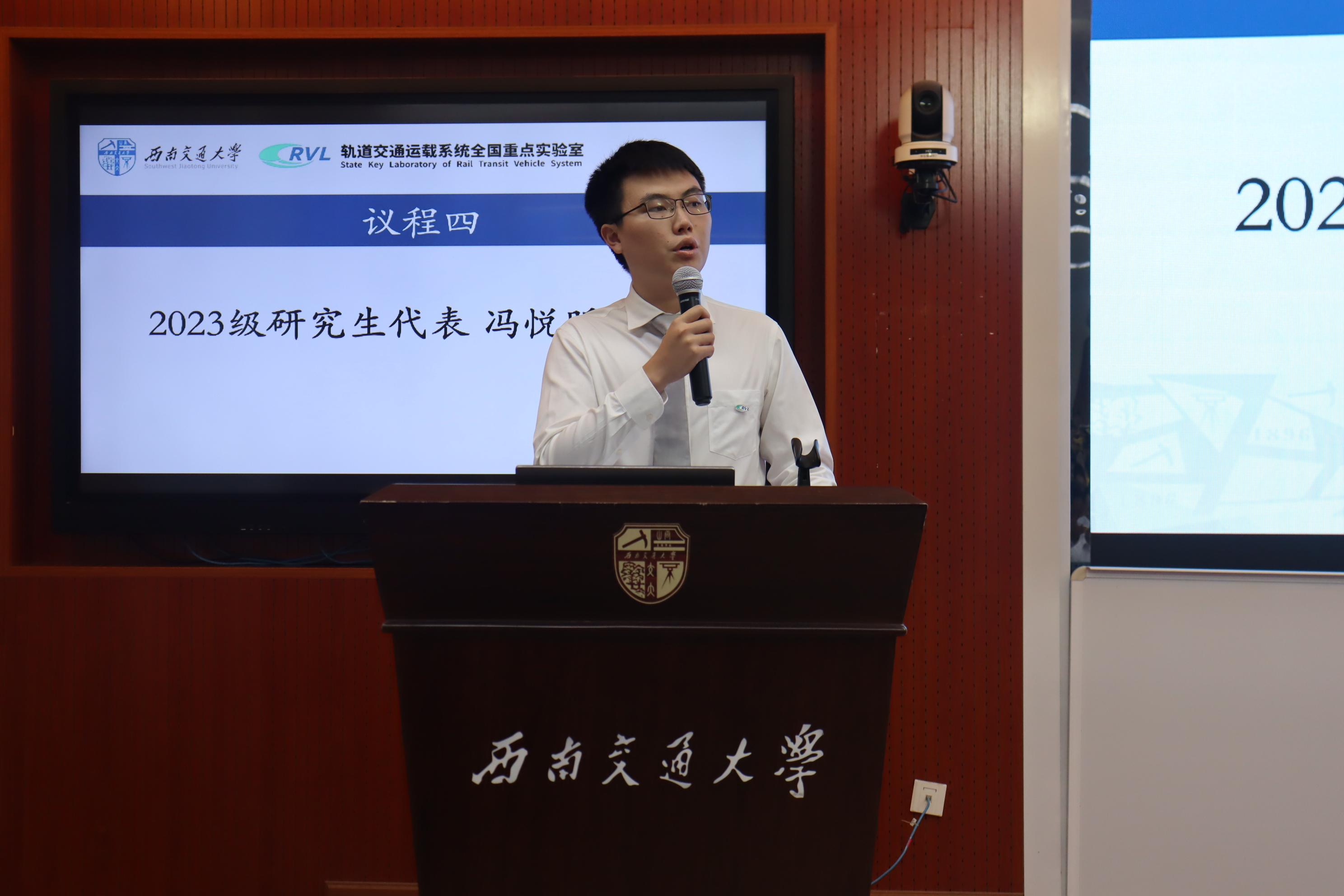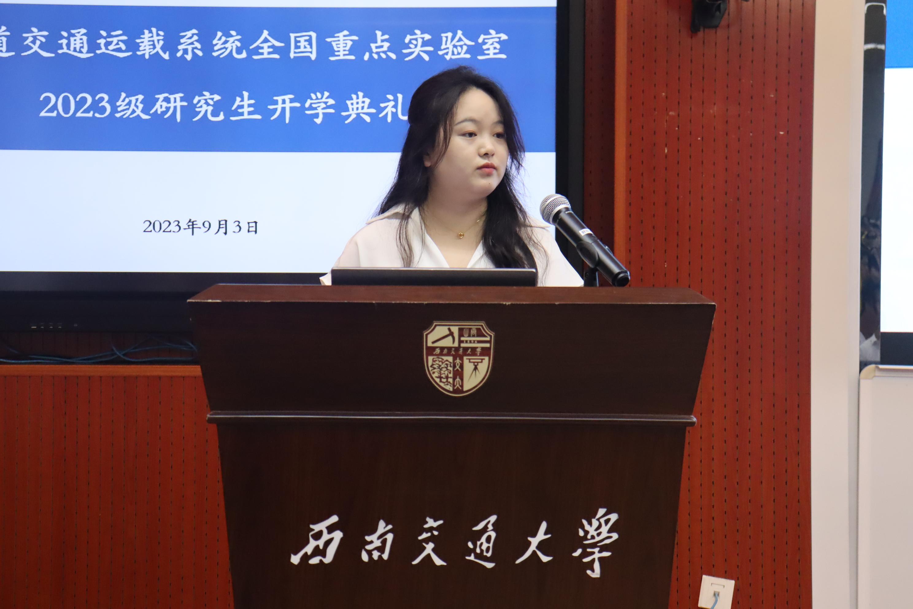 2023级新生代表冯悦昕同学发言,他通过“青山眼前情依在,明月远处梦相随”“授人以鱼,不如授人以渔”“积土成山,风雨兴焉;积水成渊,蛟龙生焉;积善成德,而神明自得,圣心备焉”三句诗分享了自己对新征程的感悟与畅想。最后他呼吁同学们一起努力,发扬“竢实扬华,自强不息”的交大精神,成为德才兼备、面向未来的创新人才,为轨道交通事业贡献自己的智慧和力量。