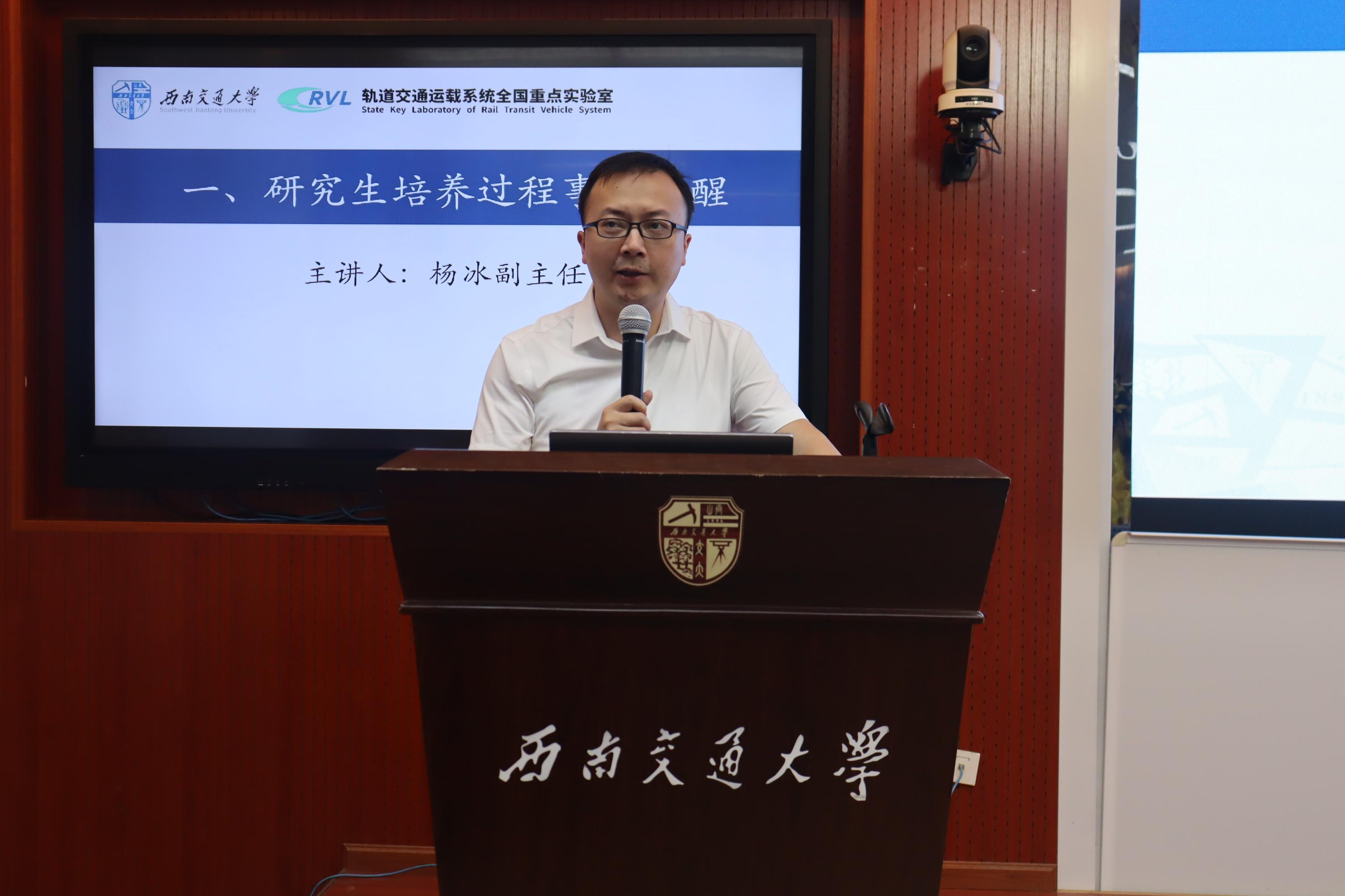 副主任杨冰对研究生培养过程相关内容进行细致地讲解。他希望2023级新同学要完成从本科生到研究生的转变;要认识到导师和同门的作用,积极与他人沟通。最后他叮嘱同学们要认真对待研究生课程并认真完成学业档案相关事宜。