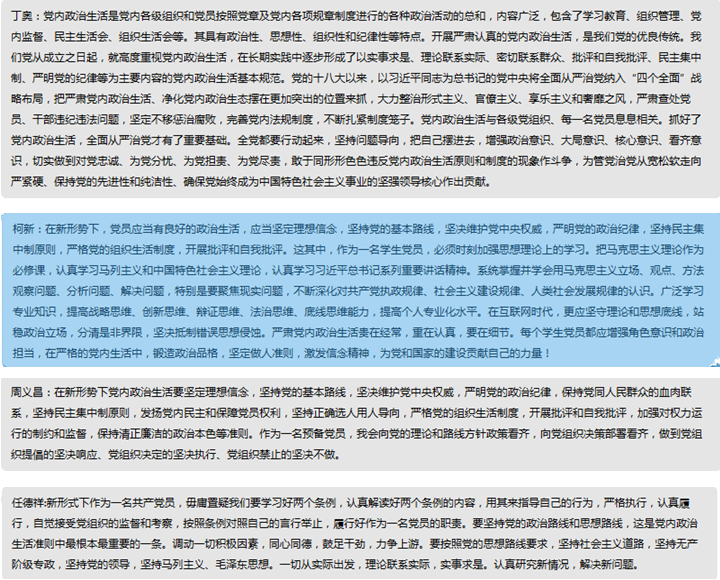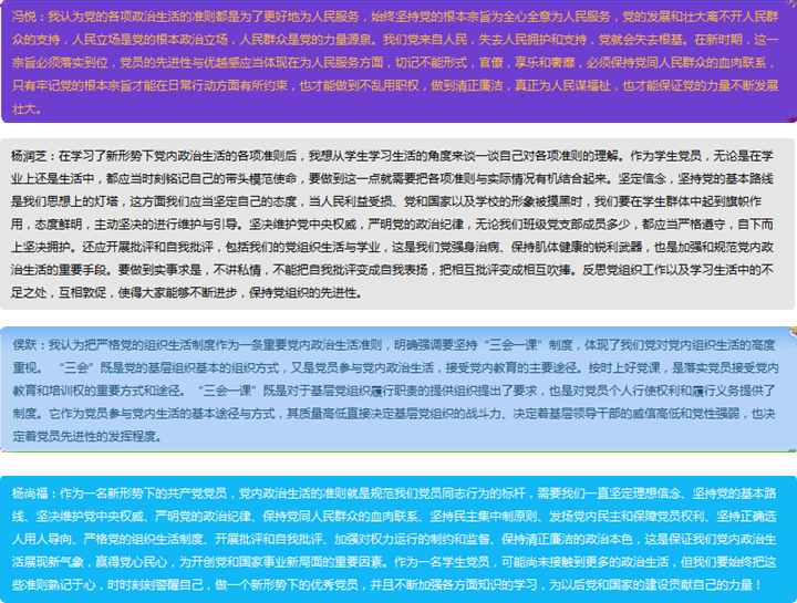 此次学习活动得到了各位成员的积极响应,通过认真学习,我们了解到严肃认真的党内生活,是我们党在不同历史时期加强自己身建设、完成肩负重大历史使命中得出的重要结论。而党的十八届六中全会审议通过的《新形势下党内政治生活若干准则》,更为全面从严治党提供了更为坚实的制度支撑。通过此次文件学习,我们对严肃党内政治生活和组织生活方面有了进一步认识。以下是各支部成员对此次学习的心得体会: