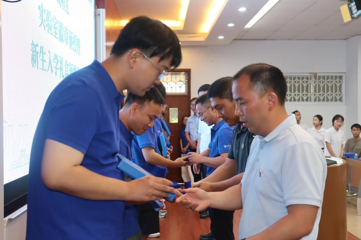 随后进行了av影片直播 徽章颁授暨新生入学礼盒颁赠仪式。av影片直播 领导及教师代表为上台的学生代表佩戴av影片直播 徽章,台下的同学则自行将徽章佩于胸前。