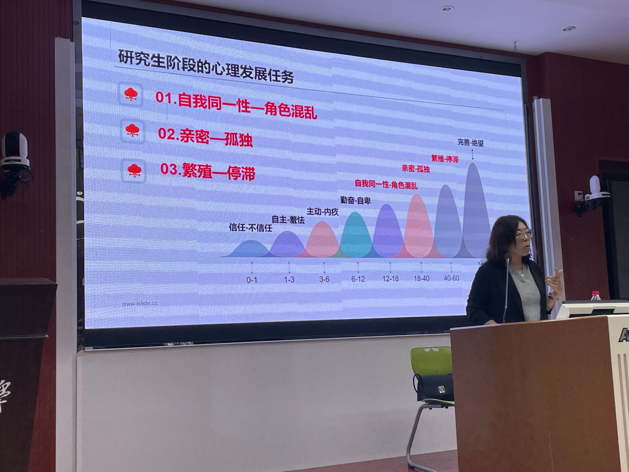 接下来,何老师以研究生这一特殊身份为切入点,详细剖析了研究生阶段的三大心理发展任务、五大常见心理困境以及积极的应对策略,教导并引导同学们如何正确看待研究生生涯中可能面临的各种压力,以及如何找到适合自己的解压方式。