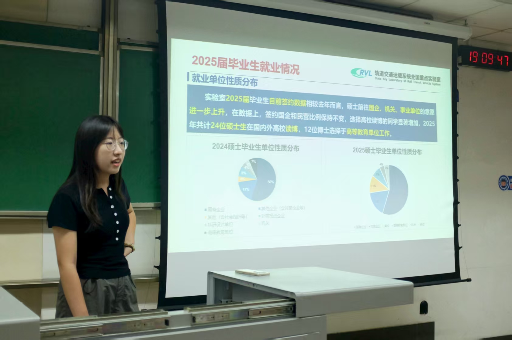 往年就业统计数据与就业情况反馈,并结合轨道交通行业发展趋势及就业资源,深入分析当前就业整体态势,随后系统解读就业签约全流程,重点明确就业推荐表打印、毕业生签约落实去向登记、档案与户口信息登记及毕业去向校核等关键环节。她强调,全体毕业生须认真学习就业系统操作规范,确保各项手续高效合规办理。
