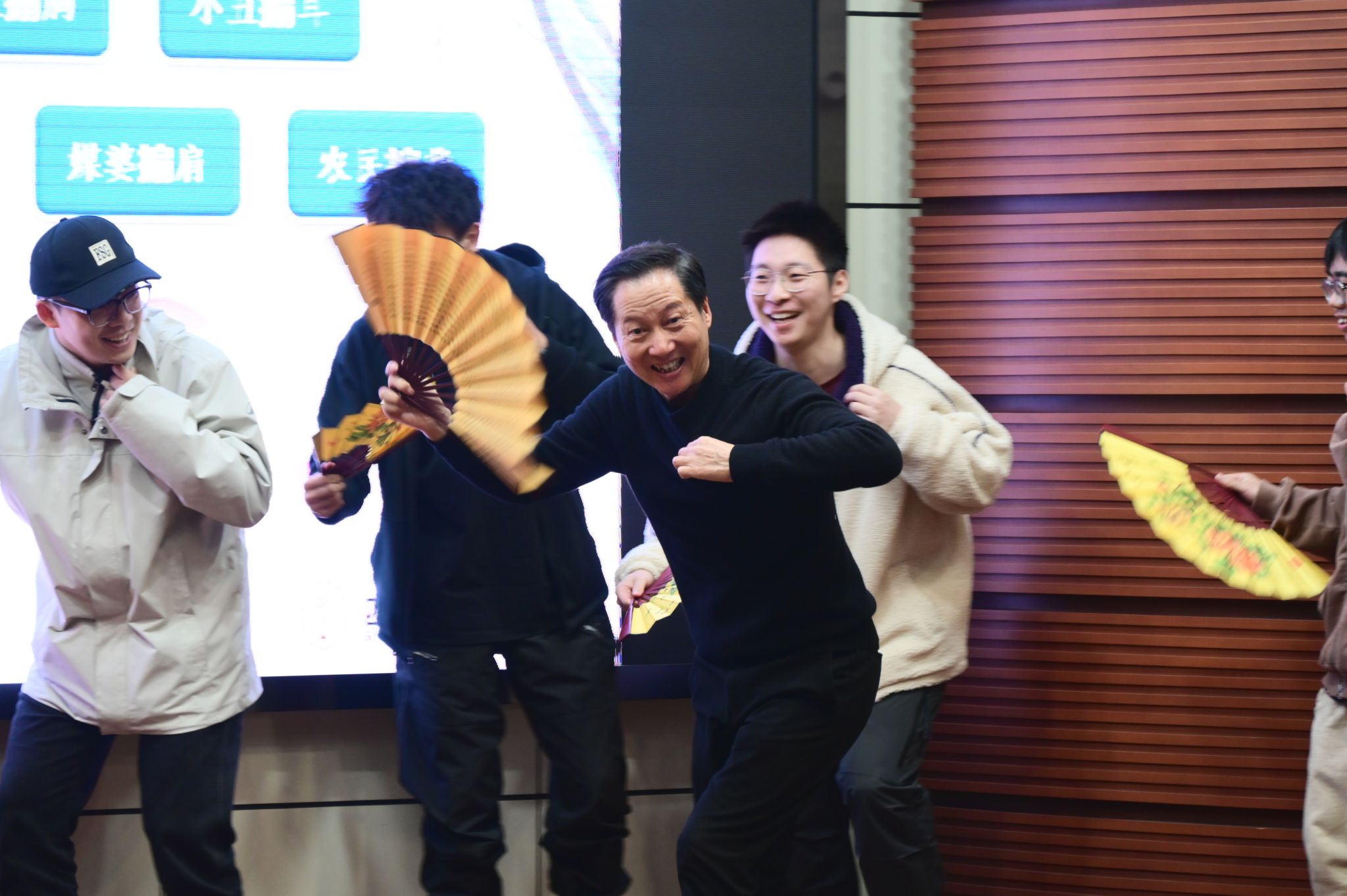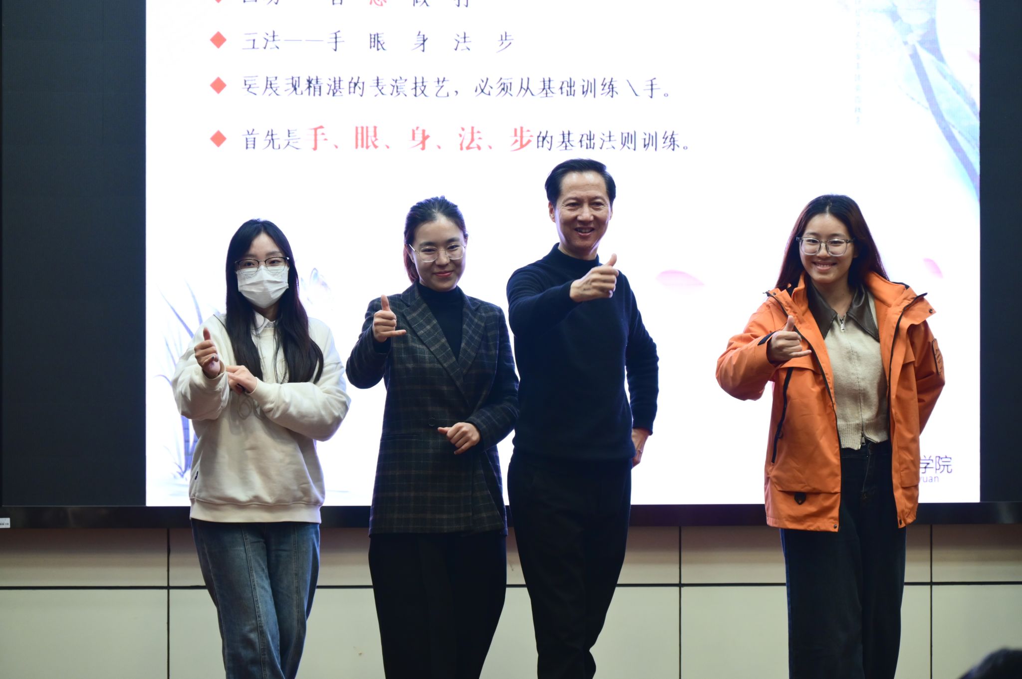 在互动体验环节,肖教授带领师生走进川剧的“台前幕后”,聚焦川剧表演基础,手把手指导大家练习指法、台步等核心动作。从眼神传情的灵动技巧,到身段舒展的韵律要领,肖教授耐心细致地逐一示范纠正,带领师生在亲身体悟中触摸川剧表演的精髓,深度感知传统艺术的文化内涵。