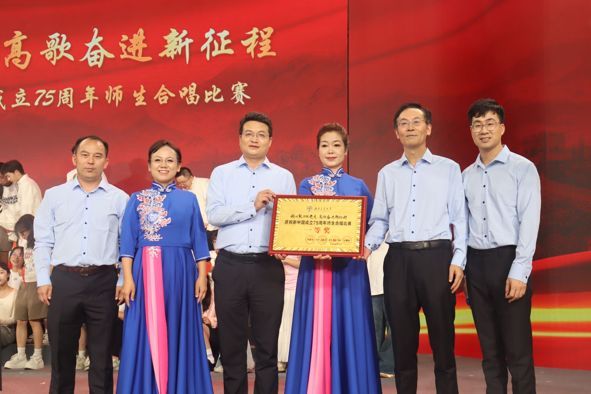 与人文学院师生组合的队伍,取得了本次合唱比赛一等奖的好成绩。校党委书记余敏明亲自为合唱队伍代表颁奖。