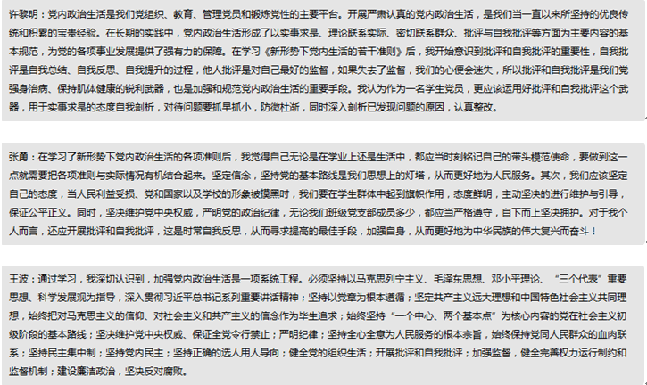 此次学习活动得到了各位成员的积极响应,通过认真学习,我们了解到严肃认真的党内生活,是我们党在不同历史时期加强自己身建设、完成肩负重大历史使命中得出的重要结论。而党的十八届六中全会审议通过的《新形势下党内政治生活若干准则》,更为全面从严治党提供了更为坚实的制度支撑。通过此次文件学习,我们对严肃党内政治生活和组织生活方面有了进一步认识。以下是各支部成员对此次学习的心得体会: