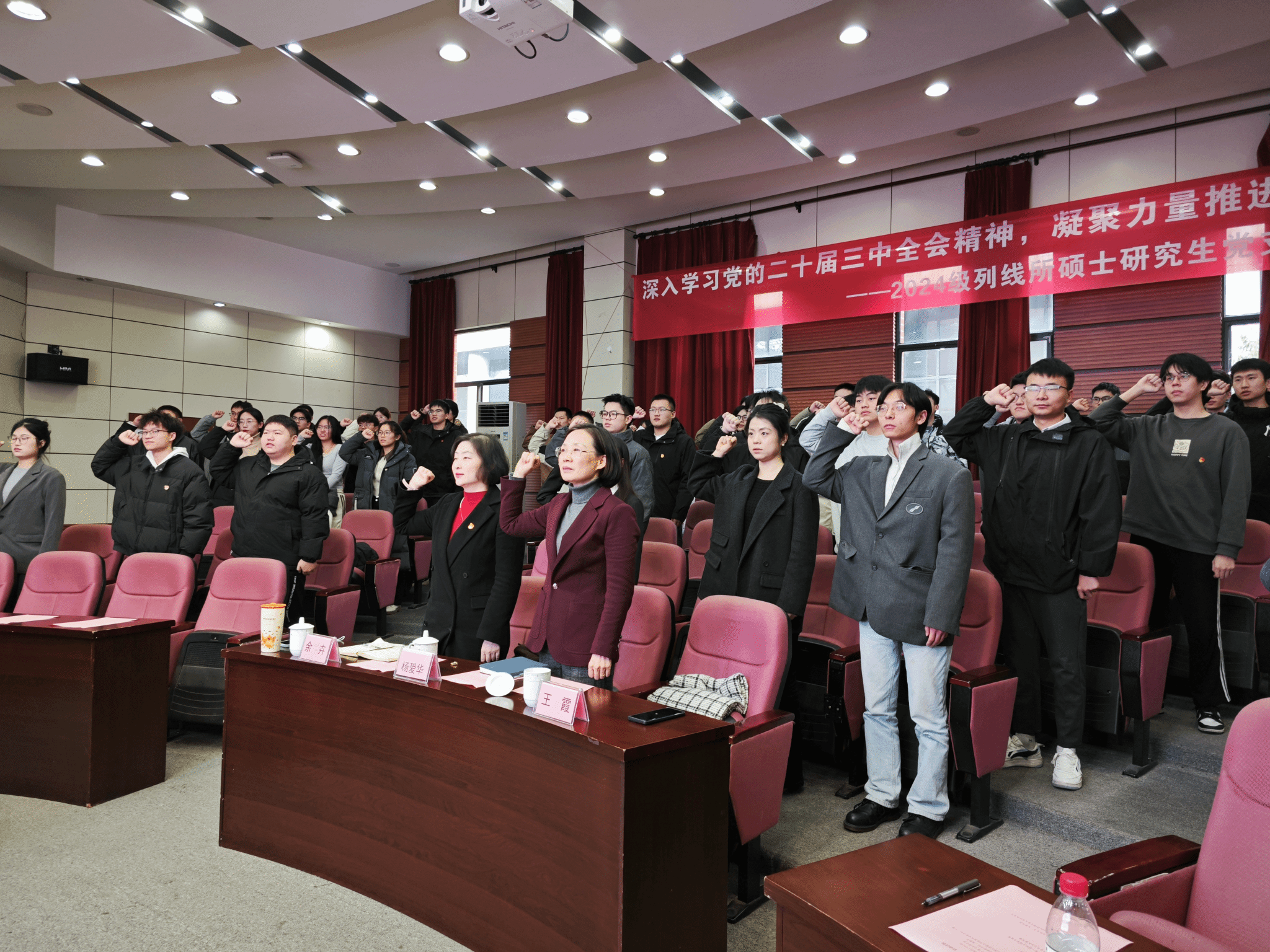 党委副书记王霞主持,学生党支部委员代表、2024年第一期新发展党员及列线所2024级硕士党支部全体党员参加。