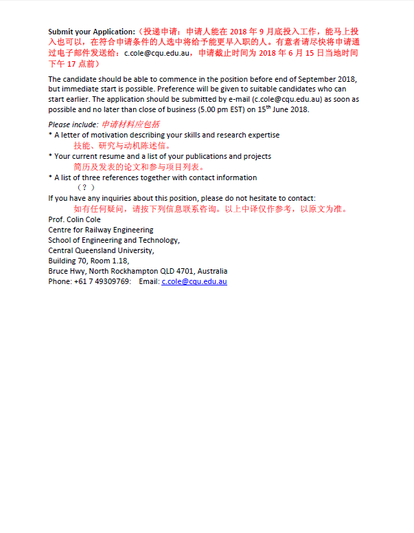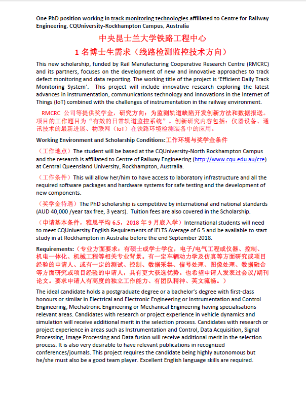 中央昆士兰大学铁路工程中心1名博士生需求(线路检测监控技术方向)