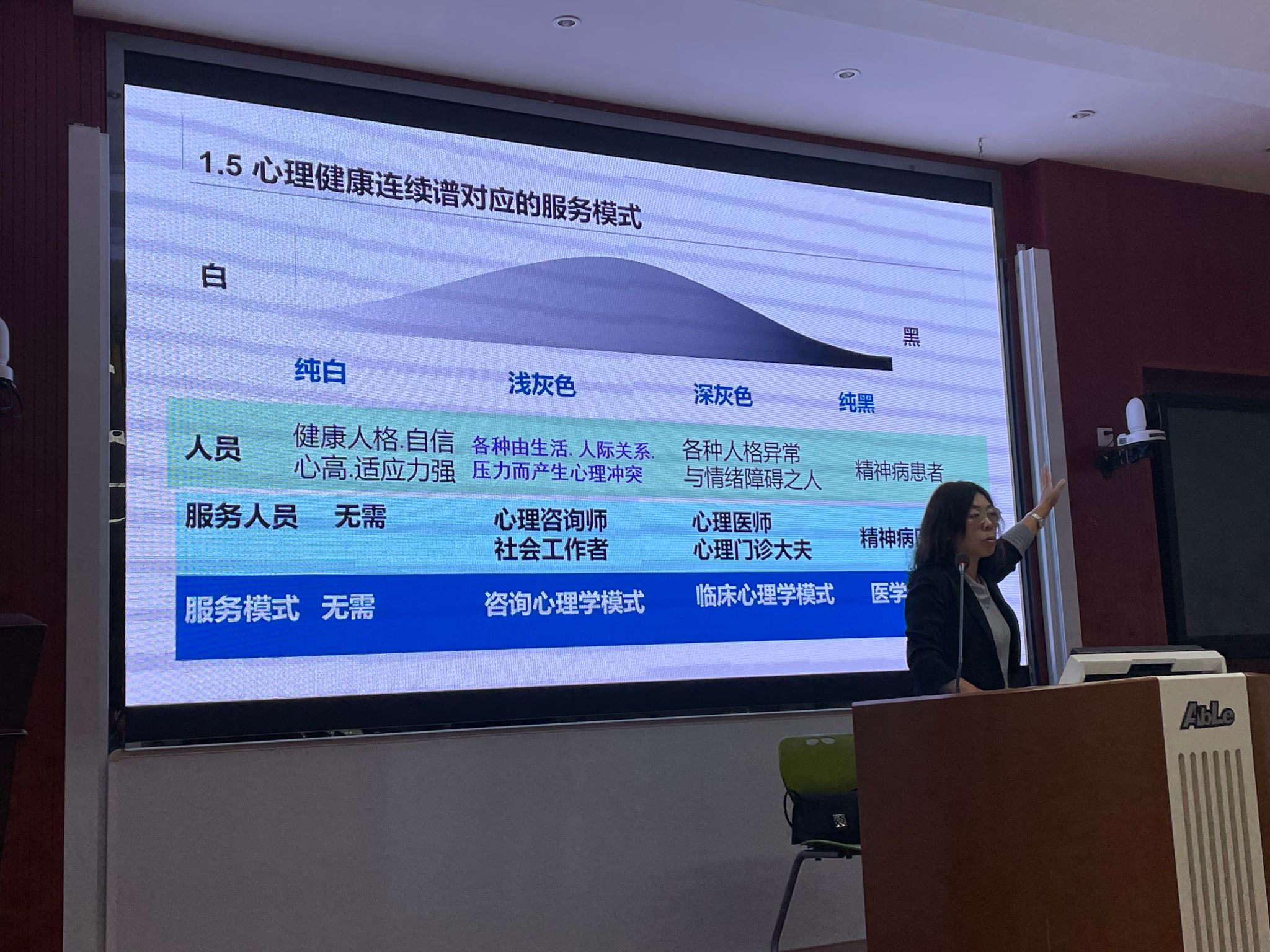 随后,申宇老师向同学们介绍了主讲老师何立群。在同学们热烈的掌声中,何立群老师的“心理适应”讲座正式拉开帷幕。何老师首先从“健康”一词的定义出发,引出当日主题“心理健康”。她强调,健康是身体上、精神上的完美状态以及良好的适应力,而心理健康往往容易被人们忽视。接着,何老师从健康的行为表现、心理健康的等级以及对应的服务模式三个方面,深入浅出地阐释了何为“心理健康”。