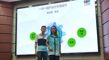 为了让理论知识真正“落地生根”,本次培训的核心环节——视障陪护出行技能实践演示由三渡潜能的陈浪老师和谢文静老师担纲。两位老师默契配合,进行了详尽专业的示范: