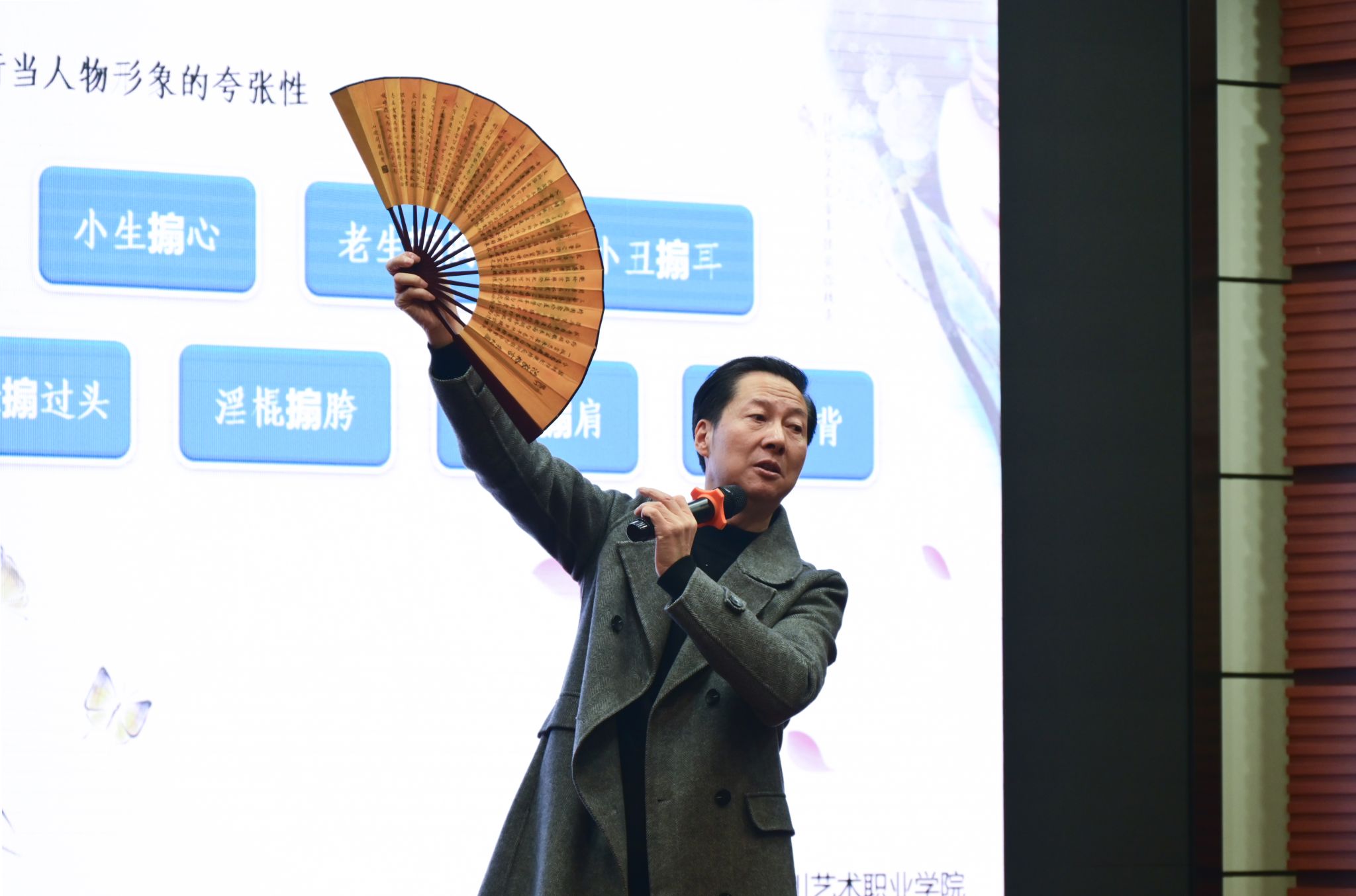 活动伊始,肖教授以川剧文化普及为切入点,从历史渊源、四大声腔、角色行当等核心知识展开讲解,让在场师生快速建立对川剧艺术的认知框架。讲解过程中,肖教授时而起身示范身段台步,时而亮嗓演绎经典唱段,用鲜活案例与现场表演的形式,将川剧“唱念做打”的艺术精髓具象化呈现,现场氛围愈发热烈。