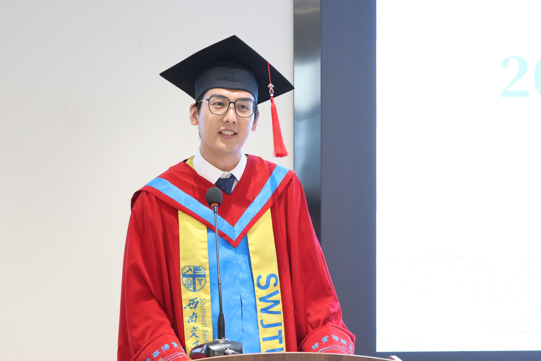 随后是毕业生代表谢清林博士发言,他表示毕业后将以“竢实扬华”为明灯,以“自强不息”作征帆,不负交大人的荣光。导师代表赵鑫老师则送上最质朴又深刻的临别箴言,他鼓励学子们要“好好感受生命的美好”,要“辩证思考充满矛盾的生活经验”,更要在“遭遇挑战时勇敢面对和自强不息”。
