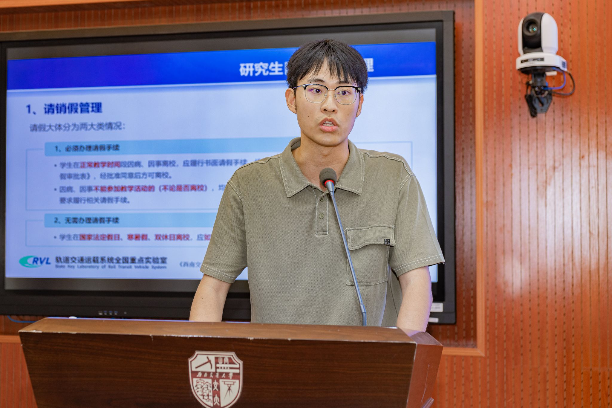 接着,2025级辅导员陈宇豪向同学们讲解研究生日常管理及奖勤助贷相关内容。他主要从请销假制度、宿舍管理、奖助学金、申请入党等几个方面进行了介绍,叮嘱同学们要严格遵守av影片直播