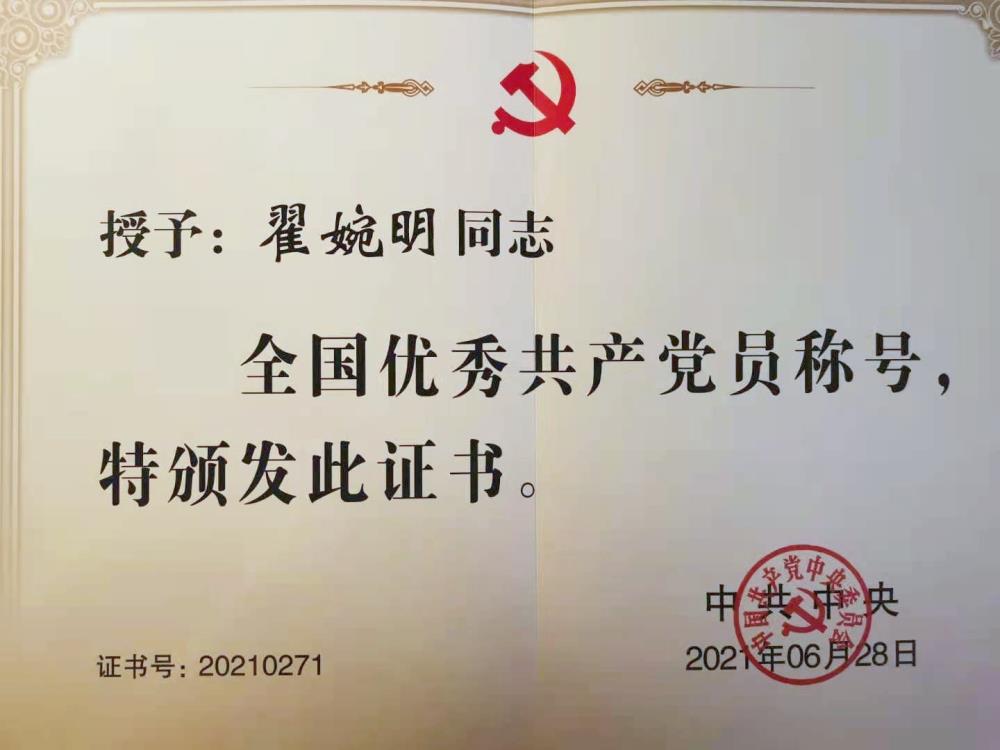 6月28日下午,全国“两优一先”表彰大会在京举行,会上党中央对400名全国优秀共产党员(含拟追授16人),300名全国优秀党务工作者(含拟追授2人),499个全国先进基层党组织进行表彰。翟婉明入选全国优秀共产党员并受到大会表彰。在京期间,翟婉明还受邀参加了建党百年系列庆祝活动。